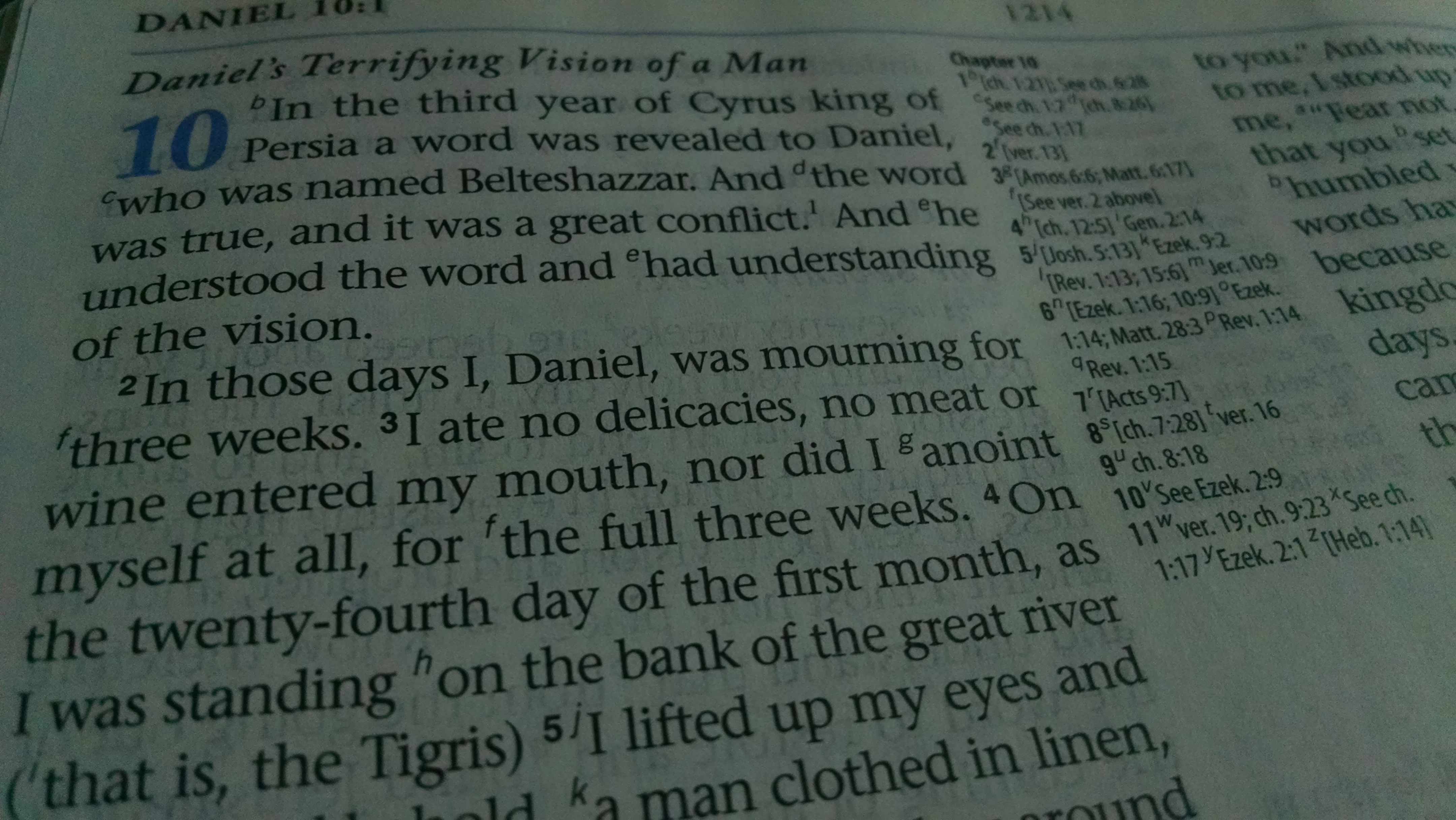 It is the third year of King Cyrus of Persia, Daniel receives a word from the Lord about the end times and wrath of God, which was revealed in chapter 9; this word is troubling to Daniel since he understands everything that is in the vision; Daniel mourns and fasts for three weeks; on the 24th of the first month, Daniel looks up and sees a vision of a man while standing on the bank of the Tigris River; Daniel describes the radiant and glorious appearance of the man; Daniel informs the reader that he is with others, but the others do not see the man as he does but experience a great trembling; Daniel loses all his strength and becomes pale; Daniel hears the man speaking and immediately falls to the ground; the man touches Daniel, calls him beloved, and sets him upright; Daniel stands trembling; the man reassures Daniel to not be afraid but that because he has humbled himself before God and has set his heart to understand, his words have been heard; the man tells Daniel that he has come because of Daniel’s words; the man tells David that there has been a delay in his coming because “the prince of the kingdom of Persia withstood me,” which allude to heavenly/spiritual warfare; the man tells Daniel that he has come to tell him what will take place in days yet to come; Daniel then looks to the ground and cannot speak; “one in the likeness of the children of man,” an angel, comes and touches Daniel’s lips and he speaks; Daniel tells the angel that he is unable to articulate all that he has seen because he has no strength or breath left in him; the man touches him, strengthens him and tells him that he is greatly loved, not to fear, to be strong and be of good courage; the man tells him that he must return to fight against the prince of Persia and that soon the prince of Greece will come – alluding to an unseen spiritual war going on contesting for the hearts of the leaders of these nations; the man tells him that he will continue to reveal what will take place, which goes on into chapters 11 and 12; Michael, the angel, intends to contend with the man for these nations.