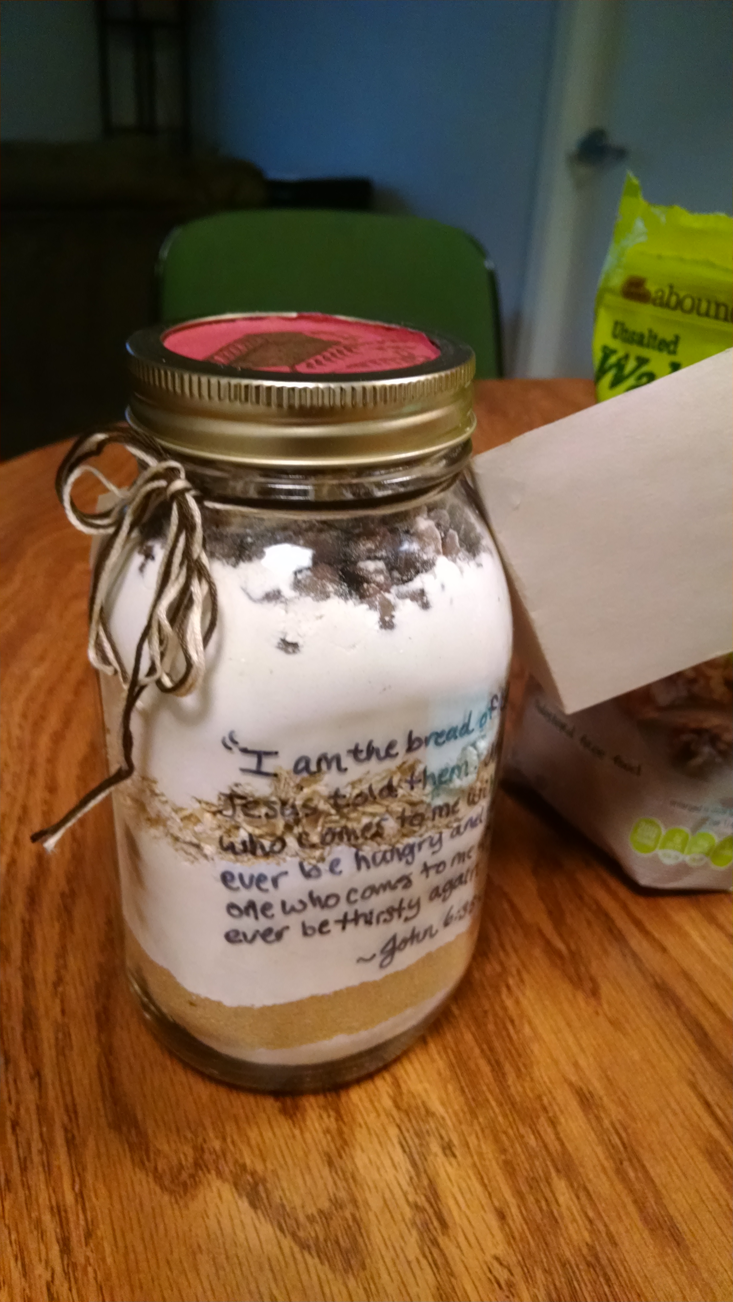 Product: Jar of Chocolate Chip Oatmeal Bread Mix, as a gift to a non-Christian, with attached recipe for the recipient to make the bread and attached gospel paraphrase.