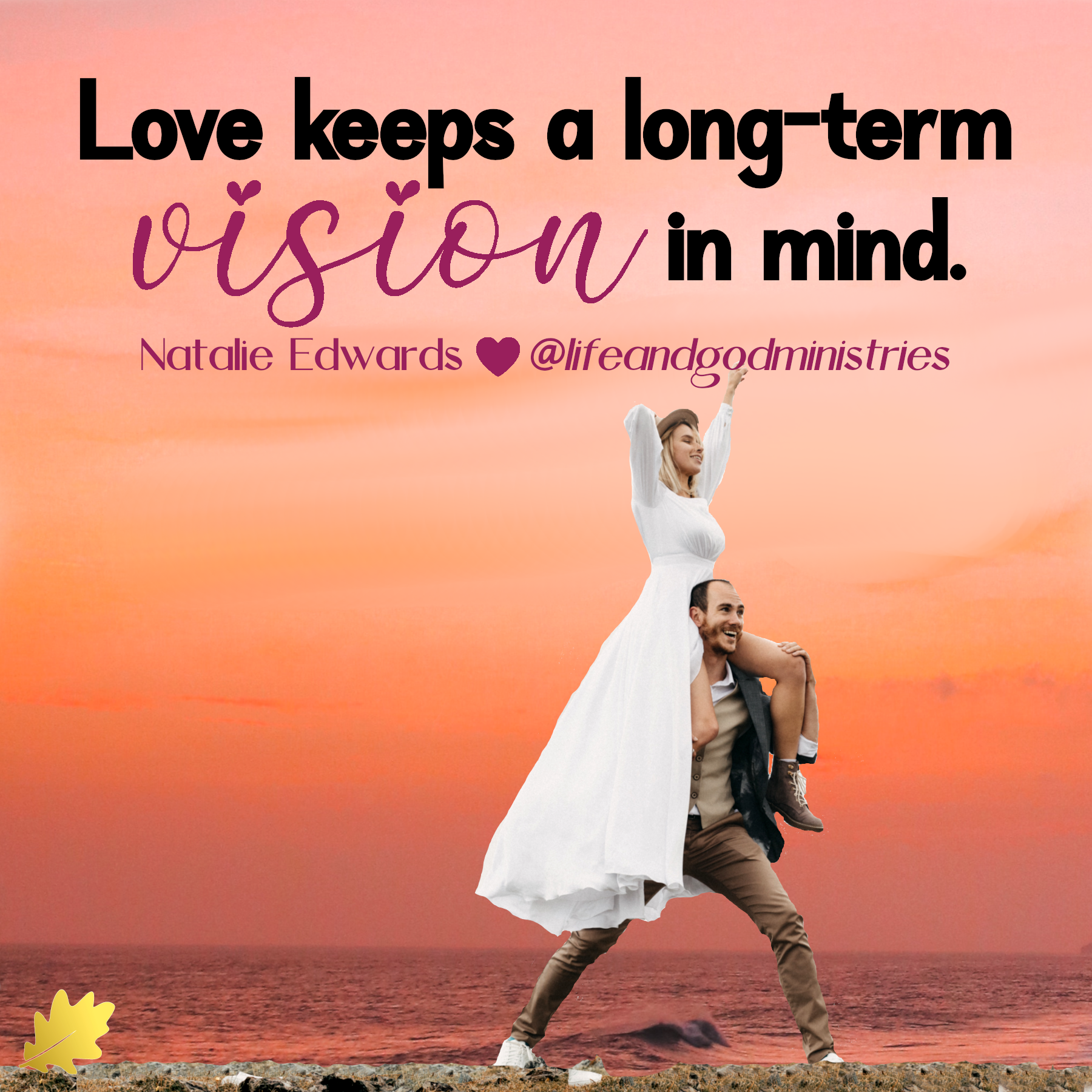 Love keeps a long-term vision in mind because love is in it for the long haul. Don’t get short-sighted or you will forget the ultimate vision God has for His story of humanity. Our lives are for Him. His love is for us.